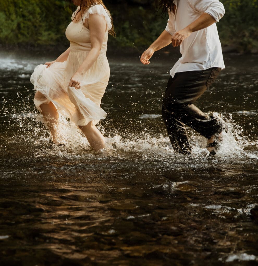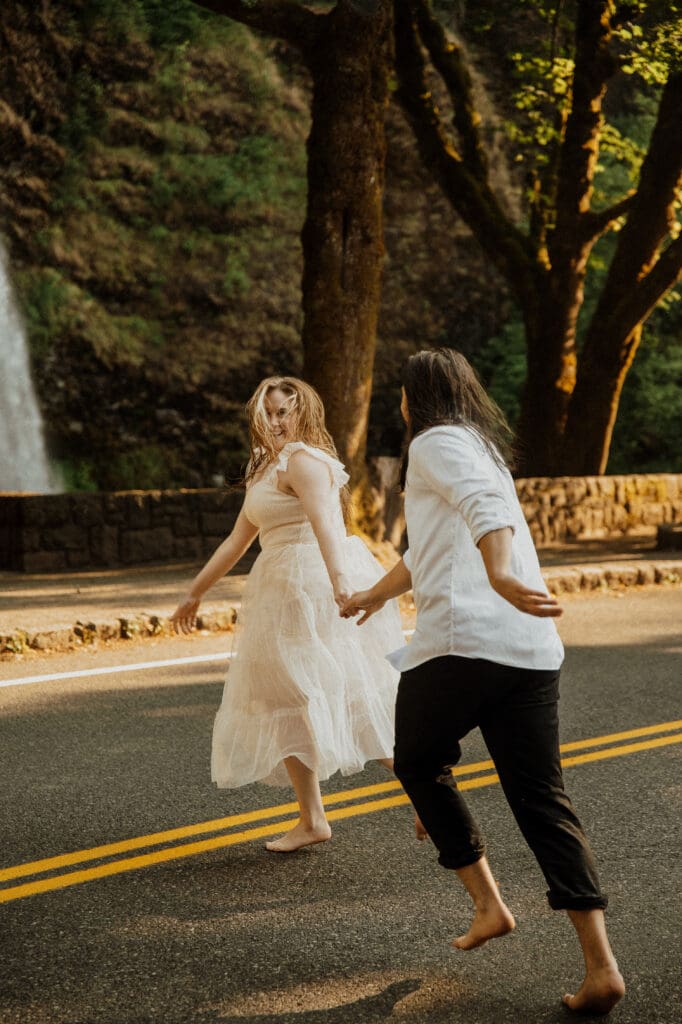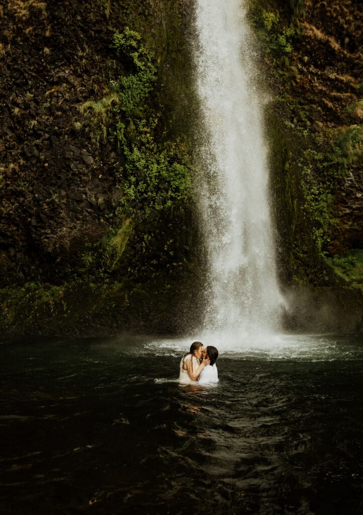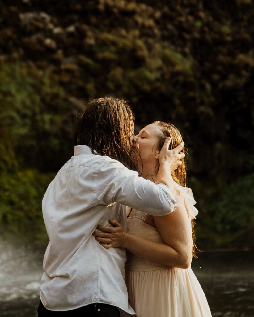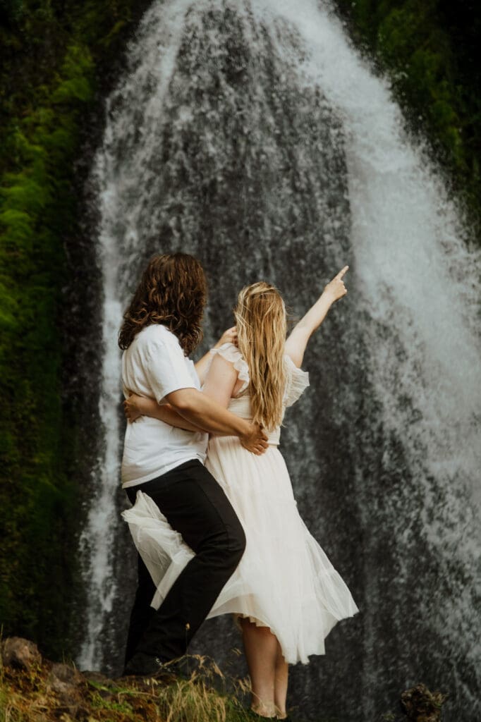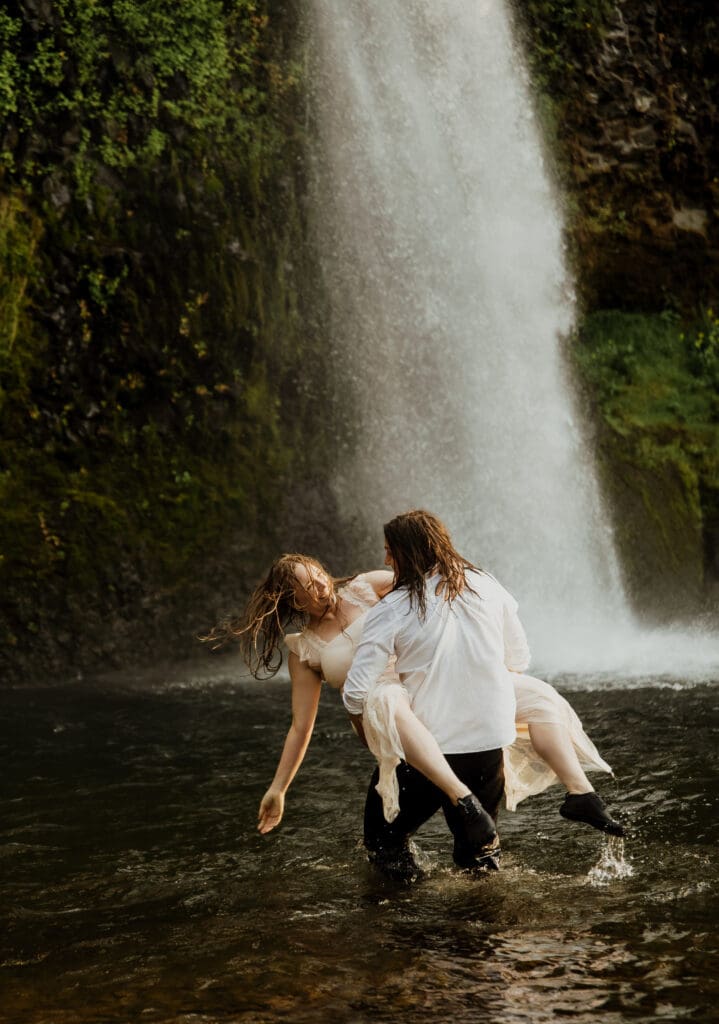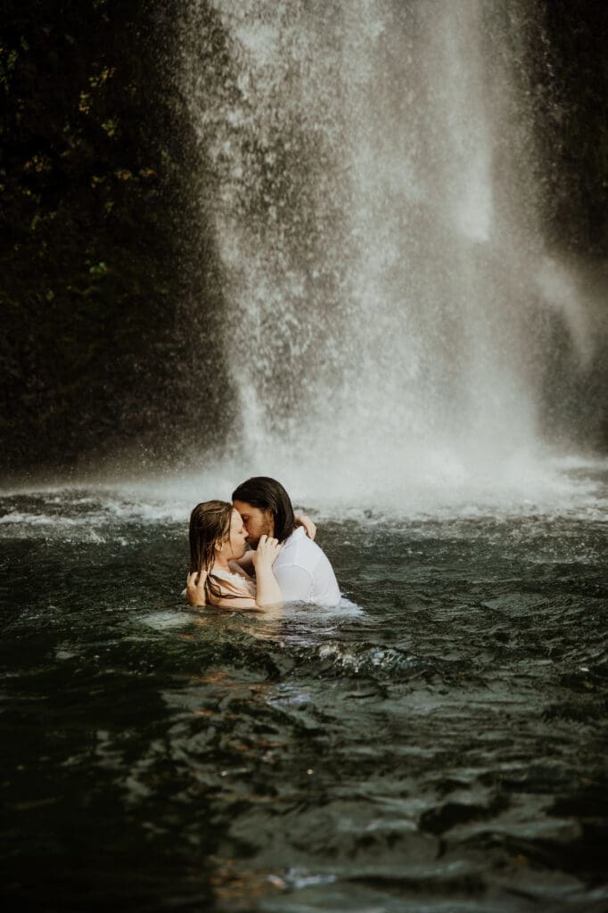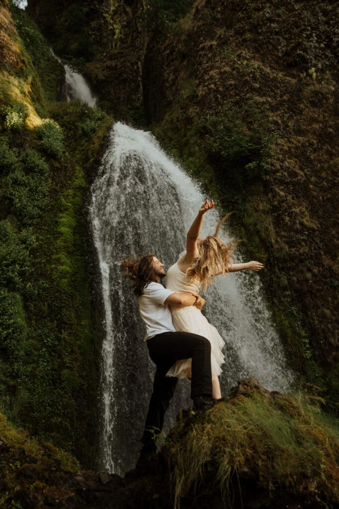 The Columbia River Gorge is one of the most versatile engagement photo locations in Oregon. Within one session, you can have mossy waterfall intimacy, adventurous swimming moments, and dramatic cliffside sunset portraits.