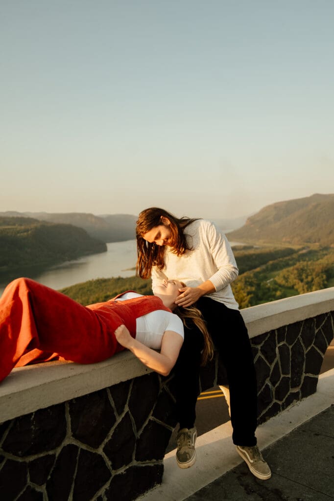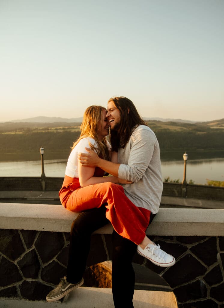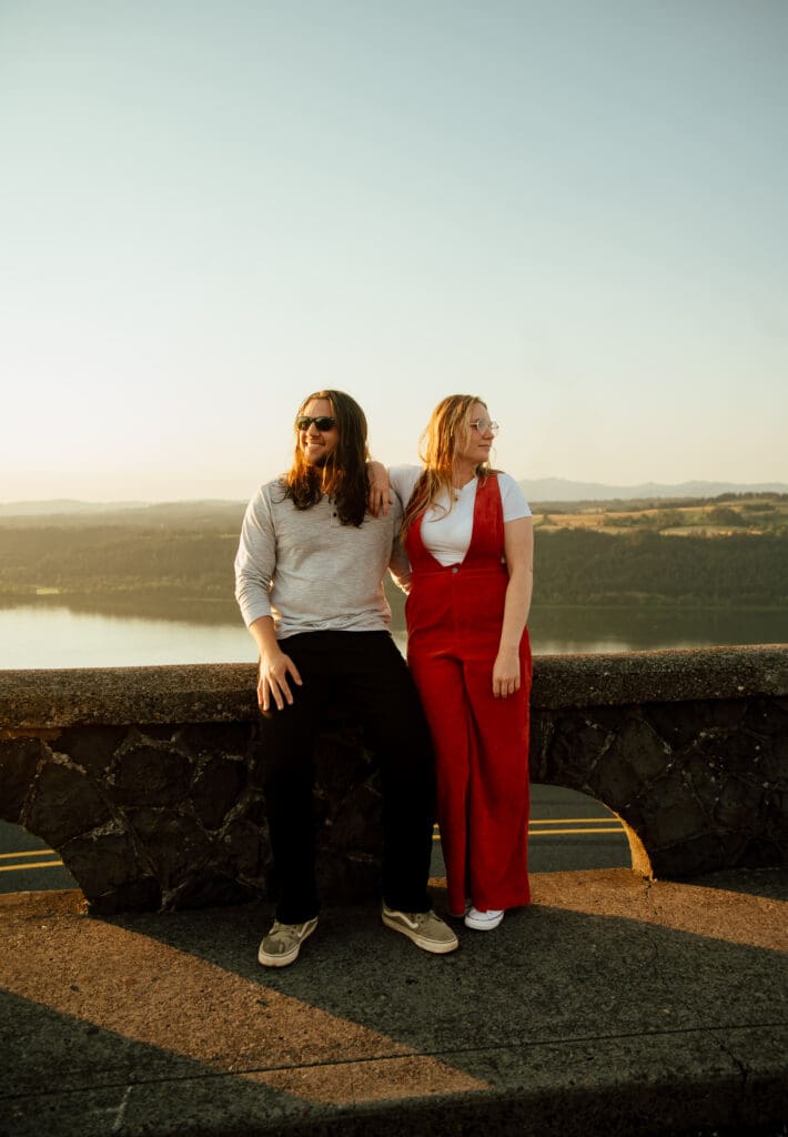 If you’ve ever seen sunset at Vista House, you know how unreal it can be. Wind whipping through her hair, retro 70s-inspired sleeves catching the light, the two of them barefoot and wrapped around each other. It felt like a vintage film still.