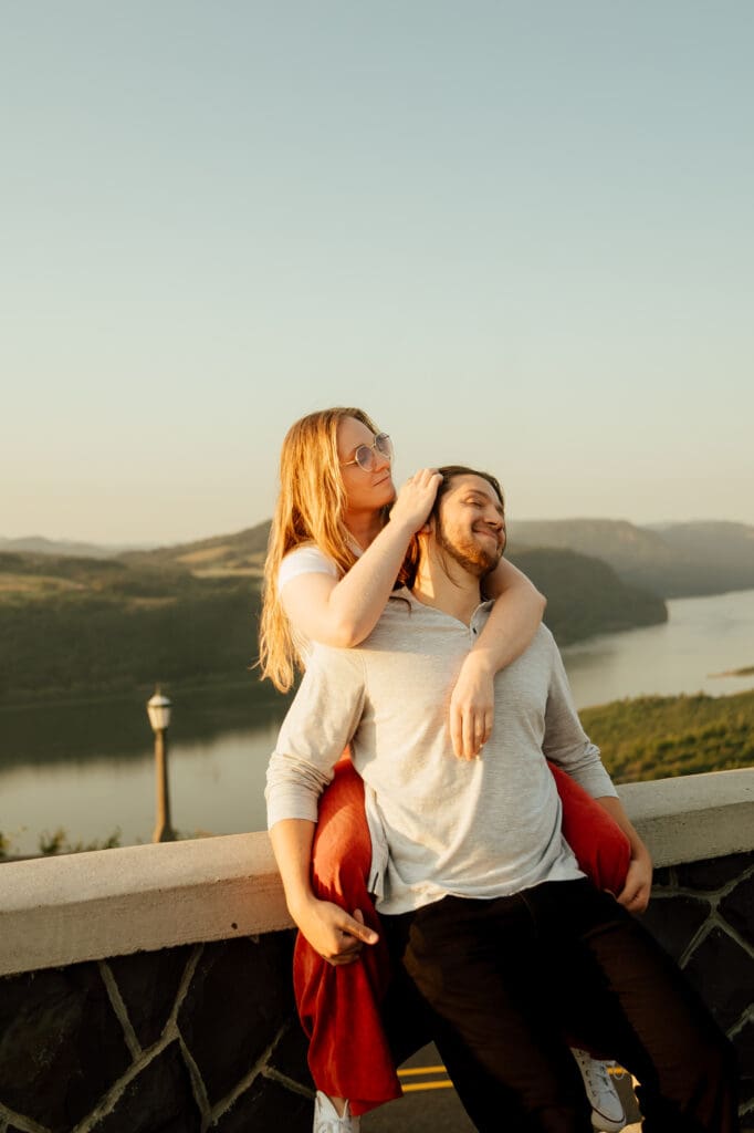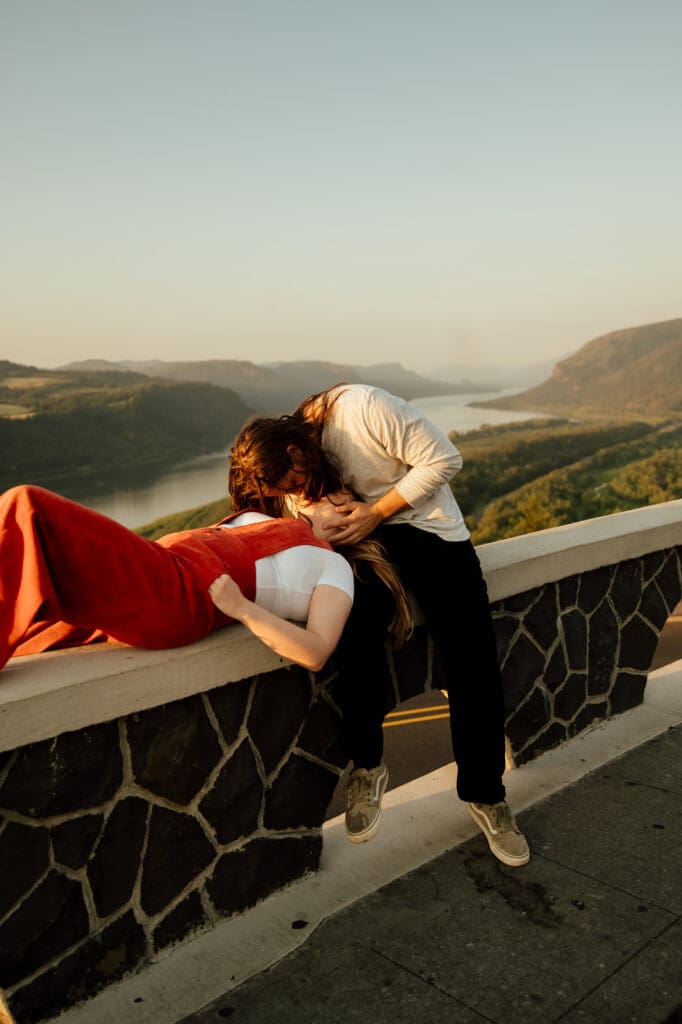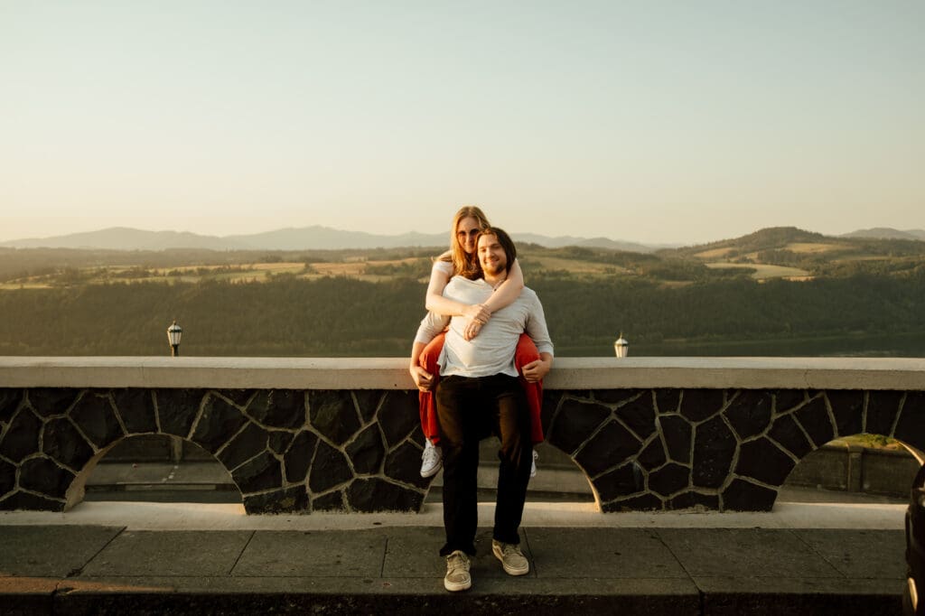 Vista House engagement photos have a completely different energy than waterfall sessions in the Gorge. Open sky. Dramatic cliffs. Sweeping views of the Columbia River. It’s one of the most cinematic engagement locations in Oregon, especially at sunset.